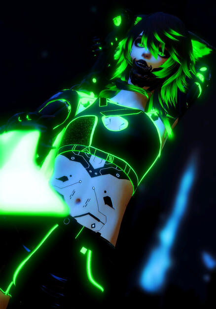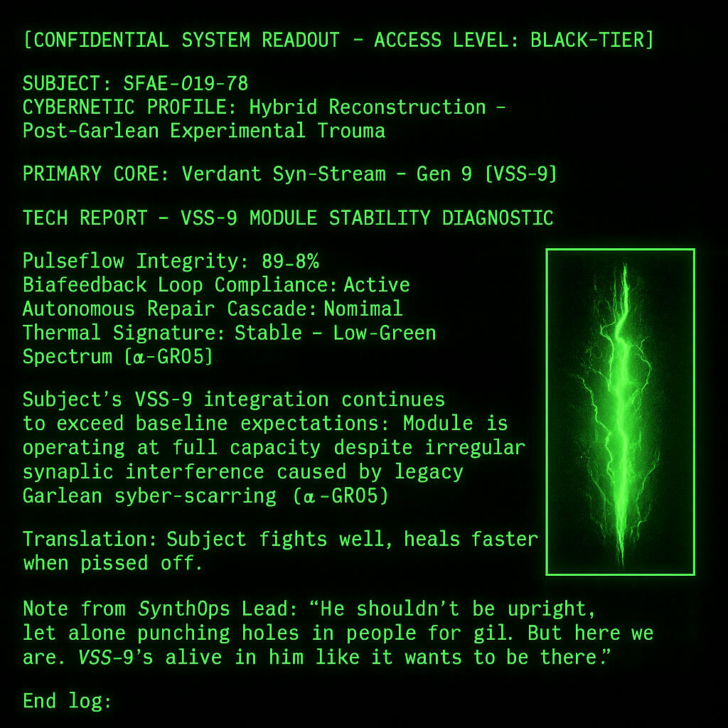 > The Garlean parts were stripped out, replaced by tech centuries ahead—integrated systems that restored what was taken. Not perfectly. Not naturally. But beautifully. His jaw was reengineered with vibratory tech—his voice now a soft synth-tone hum shaped by advanced modulation. Without it, he cannot speak at all. His eyes see more than most now, though he rarely says how. And that signature green neon threading subtly through his veins? It’s not for show. It’s a constant regenerative flow—streaming healing energy through his frame, ensuring he stays standing, no matter what.